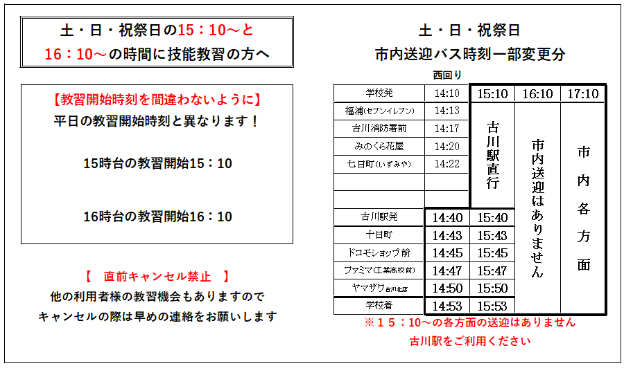 土曜日・日曜日の延長教習及び市内バス時間の変更について
